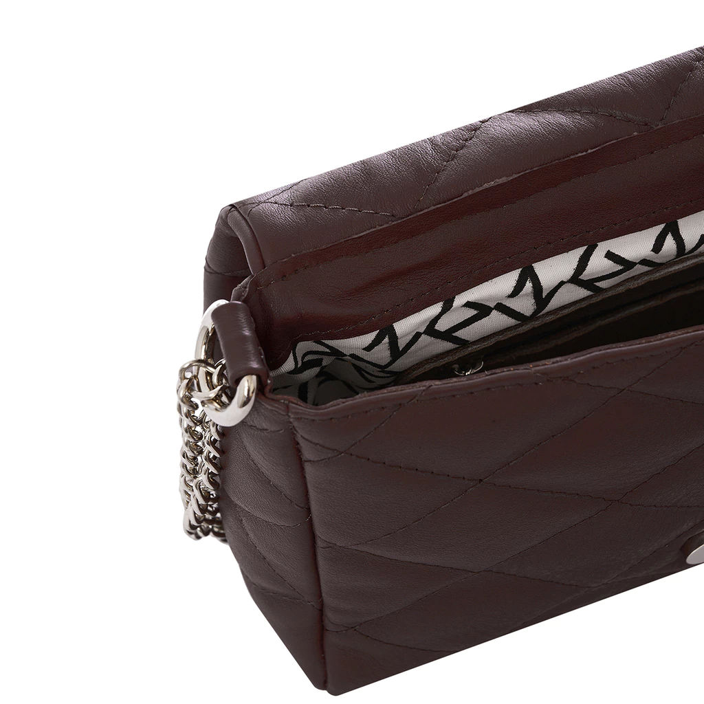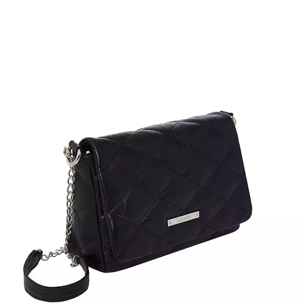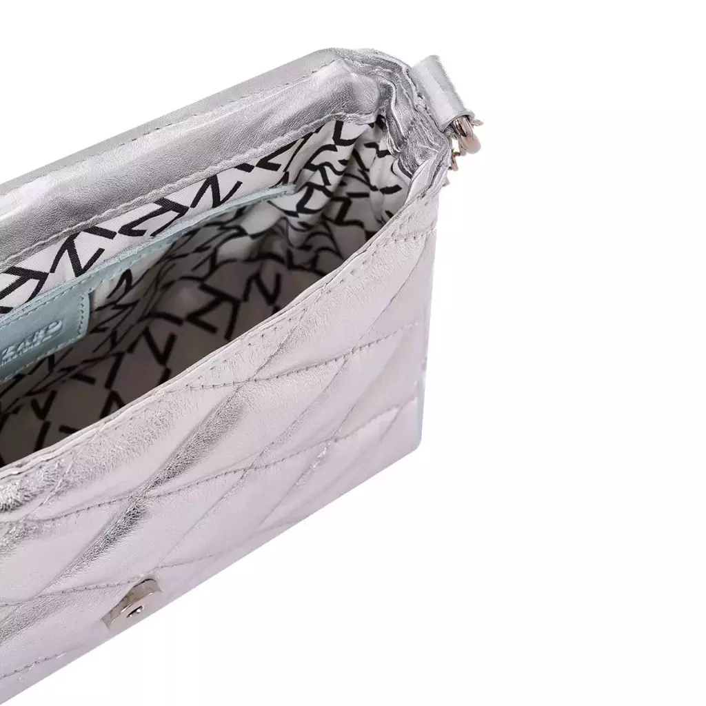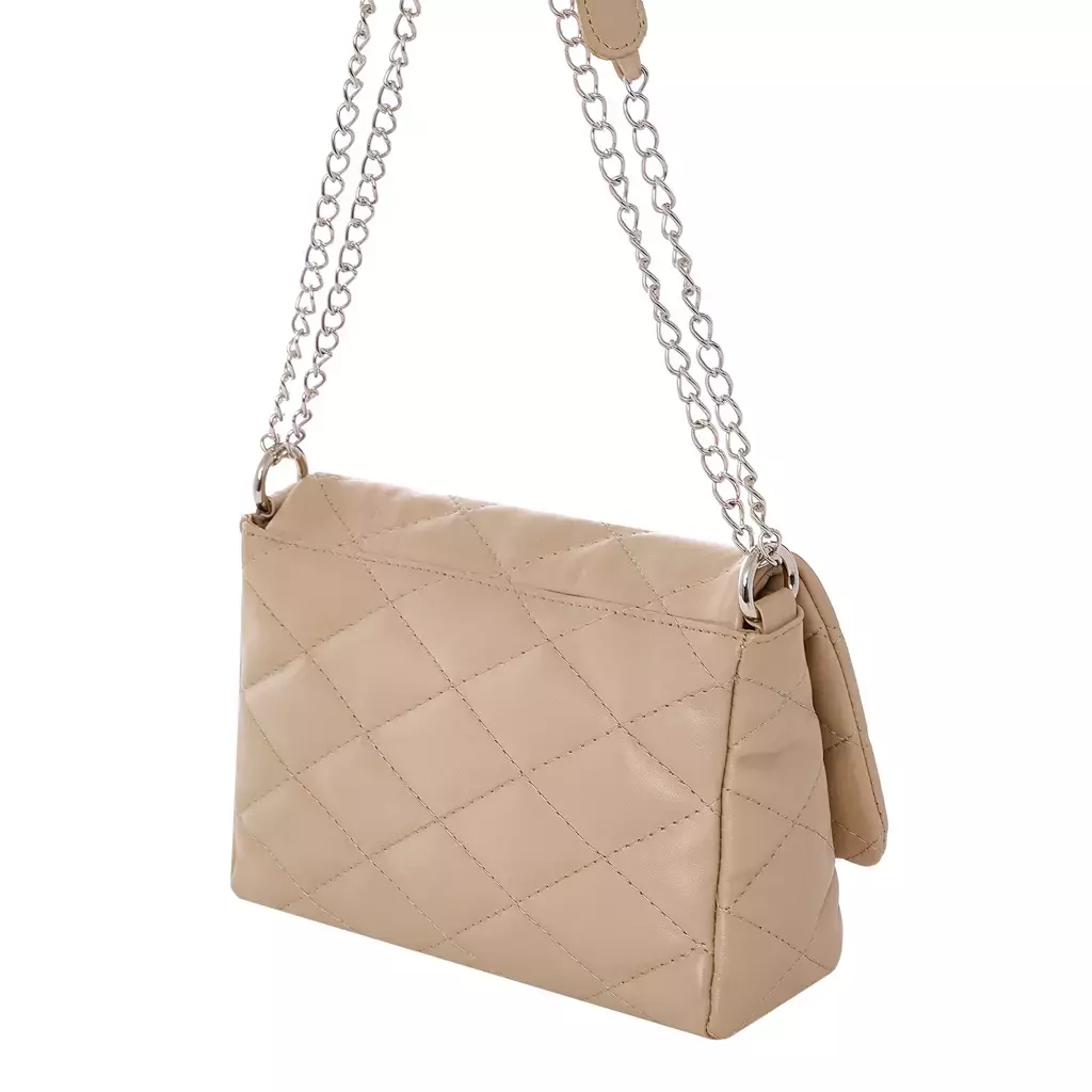 El acceso principal es mediante un práctico botón imantado. Los herrajes niquelados y la cadena para colgar al hombro le dan un toque de distinción y modernidad.