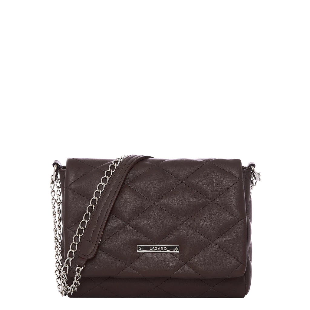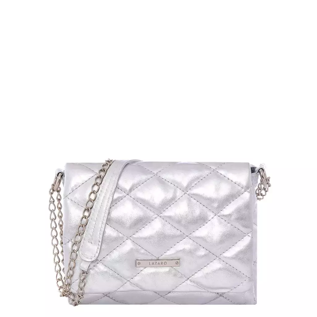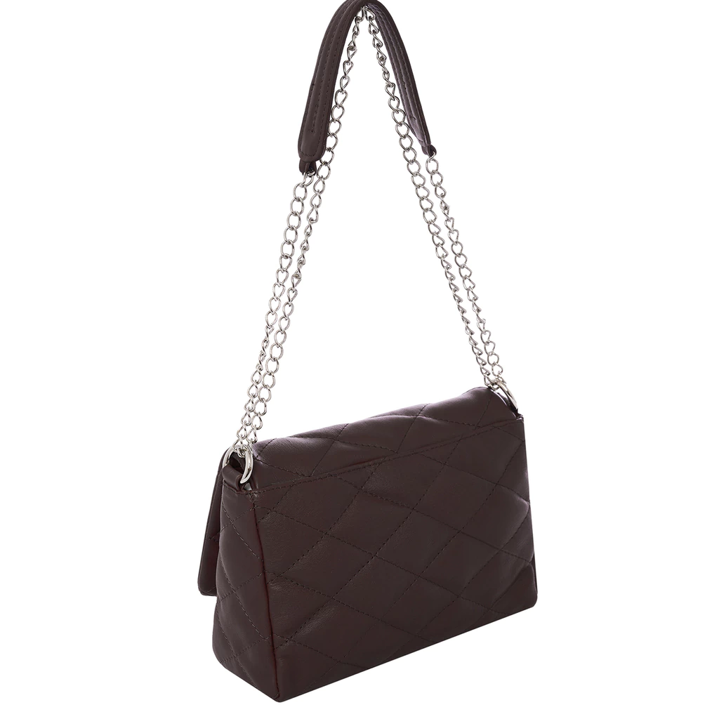 El acceso principal es mediante un práctico botón imantado. Los herrajes niquelados y la cadena para colgar al hombro le dan un toque de distinción y modernidad.