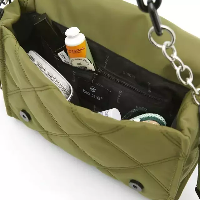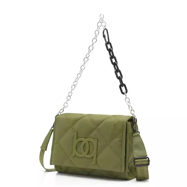 Con presencia. Su textura matelassé y el logo en relieve crean una pieza que se luce sin esfuerzo. La cadena metálica suma ese plus edgy que la hace única.
