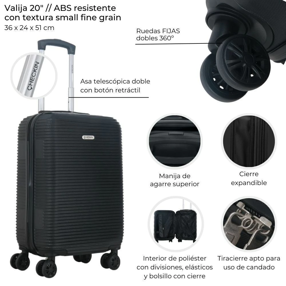 Compuesta con material ABS. Cuenta con ruedas dobles 360° para que transportes de la forma más cómoda. Ideal para 10kg. División interior con bolsillo y sujetador elástico. Manija Retractil. Ultraliviana.
